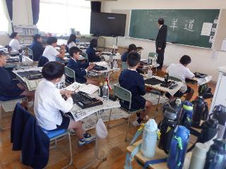 4・5年複式学級の書道の授業をしました。4年は「羊」5年は「道」、課題は別々ですので「わたり」の授業になります。教頭先生と初めての書道ということもあり、子どもたちはスタート前から準備を整えて待っていました。どちらの字にも気をつけるポイントが似通っているところがありました。そこをおさえたうえで、さあ練習です。学年別々の課題であるとはいえ、それぞれに集中できており、真剣さを共有しながらとりくむことができました。