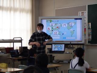 ALTと初回の授業をしました。今年度もアンソニー先生です。また、昨年度カナダで研修をしてきたY先生が外国語の教科担当をします。今日は3・4年生合同の外国語活動の1回目、もちろん3年生は初めてです。2人の先生の自己紹介からスタートしました。プレゼン画面と英語で趣味や好きな食べ物をはじめ、たくさんの紹介があり、それに関連してたくさんの質問に子どもたちはこたえていました。オーストラリアのこと、ニュージーランドのことなどがいろいろと登場してきました。あっという間に時間が過ぎていきました。これからが楽しみですね。