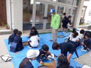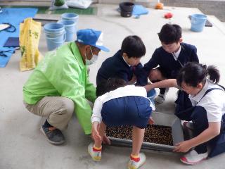 今日、3・4年生が米作りの学習で「種まき」に取り組みました。地域ボランティアの原政和さんが準備をしてくださり、今年もお世話になりました。子どもたちは、実際に苗箱に土を入れたり、種を蒔いたりといった作業を体験します。種(もみ)は2種類、「紫黒米(古代米)」と「もち米」です。原さんの指導のもと、それぞれの作業を体験し、苗箱全面に上手に種もみをまくことができました。これから生長が楽しみです。6月4日にはその苗を使って「田植え」をする予定です。