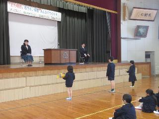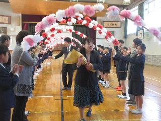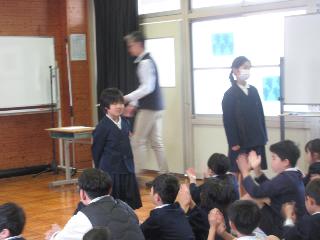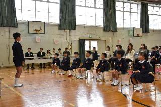 昨日は新しい先生方を迎えましたが、今日は学校を離れられる先生方とのお別れの式をしました。3年間お世話になった教頭先生、5年間お世話になった先生、それぞれにご挨拶をいただきました。子どもたちは感謝の思いをもちながらお話をしっかりと聞いていました。この学校での思い出や子どもたちへのあたたかいメッセージ等、たくさん語られました。最後に児童代表から感謝の言葉と花束贈呈を行いました。とても熱い言葉でお礼を伝えることができました。