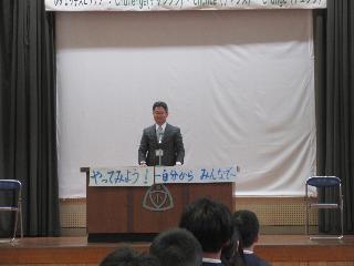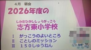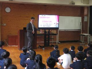 校長から「2026年度志方東小学校」のテーマで3つのことを話しました。1つ目は「学校のよいところについて」。少人数だからこそ異学年でふれあえること、仲がよいことを中心に伝えました。授業でも異学年合同があったり、いろいろな先生に教え得てもらえることにも7ふれました。2つ目は今年のミッション(合言葉)について。「やってみよう! ~自分からみんなで~」をもとに話をしました。3つ目は「150周年行事について」11月に向けて「歴史・感謝・未来」の視点から学び、発信していく機会であることを伝えました。