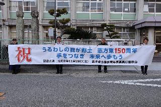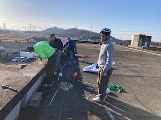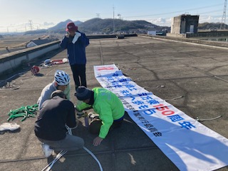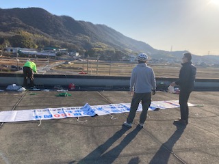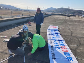 本日、早朝より周年事業実行委員会のみなさんにお越しいただき、記念横断幕を設置していただきました。校舎正面玄関の頭上、3階の壁面が設置場所です。校舎屋上にあがっていただき、コンクリートに留め金を打って頑丈に仕立てていただきました。学校だけではなかなかそこまでできません。地域の皆さんの力は絶大です。ありがとうございました。3階ですので県道からもよく見えます。これでますます周年事業に勢いがつきそうです。