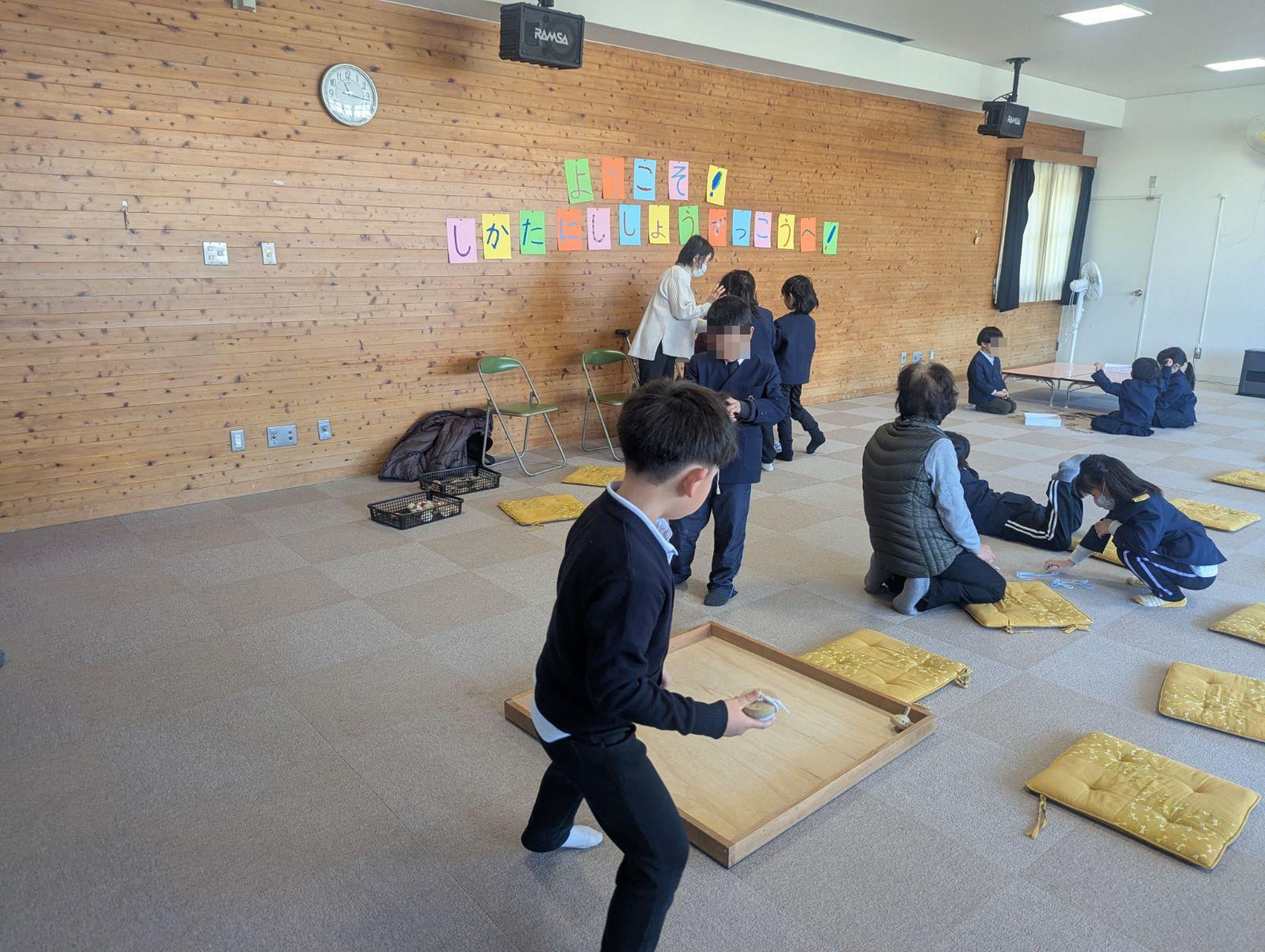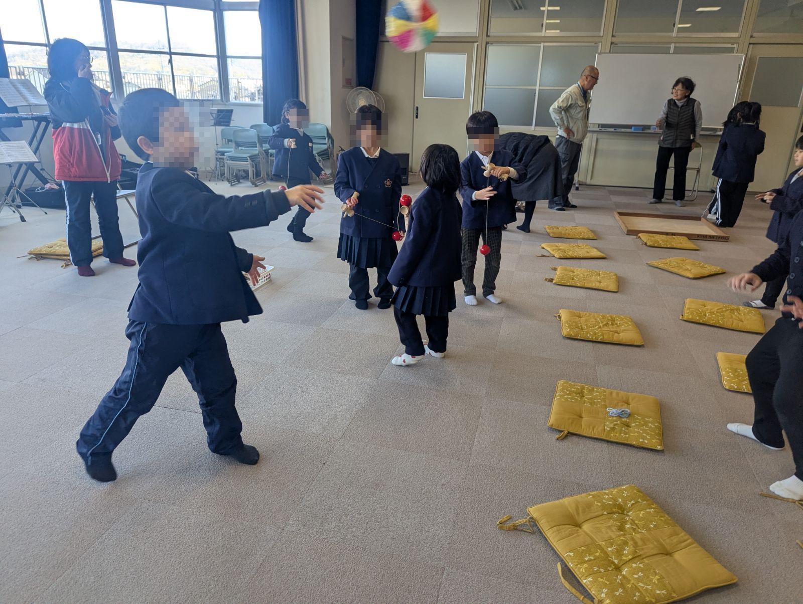 1年生の生活科の学習で「昔あそび」を楽しみました。今回は、1年生の児童のおばあちゃんなど地域のおばあちゃんたちをゲストにお招きし、遊びのコツを教えていただきました。
