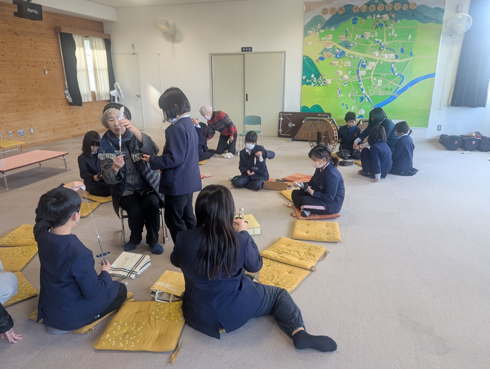授業では、本物の糸車やコマのような形をした道具を使って、収穫した綿から糸を紡ぐ作業を体験しました。ふわふわの綿が少しずつ細い糸になっていく様子に、子どもたちは興味津々。実際に紡ぐ作業は力加減が難しく、昔の人の知恵や手仕事の大変さを肌で感じることができました。