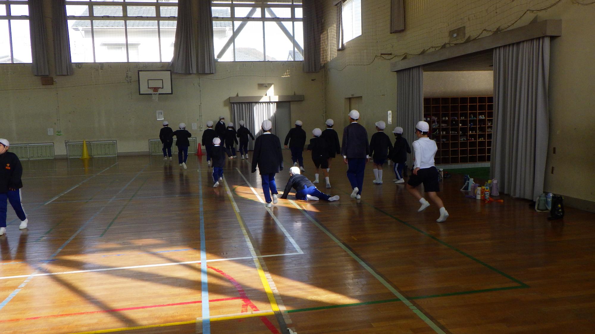 縦割り班活動「なかよしタイム」は、異なる学年の児童が一緒に楽しく活動することを通じて、相手を思いやる気持ちや協力する心を育むことなどを目指しており、6年生の児童が中心となって9マス鬼ごっこやだるまさんがころんだを楽しみました。