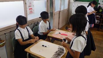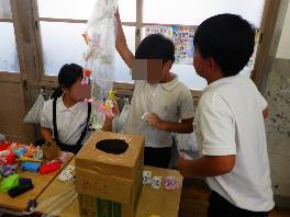 学活の時間に「お祭り遊び」を行いました。くじびき、ボーリング、福笑い、射的、輪投げの5つのお店に分かれ、協力して小物や景品などの準備を進めました。当日は、お客さんになったり、店員さんになったりしてお店を楽しむことができました。お客さんと接する中で、「もう少し細かくルールを決めればよかった」「景品が足りなかった」など改善点を見つけ、次に生かそうと考えている姿も見られました。