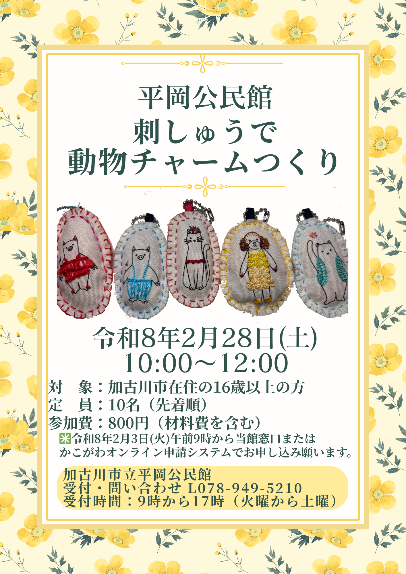 【2月3日募集開始】平岡公民館「刺しゅうで動物チャームつくり」【2月28日開催】