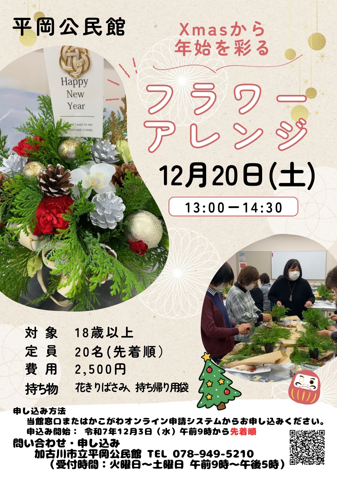 平岡公民館では、令和7年12月20日(土曜日)に、18歳以上の方を対象に「Xmasから年始を彩るフラワーアレンジ」を実施します。