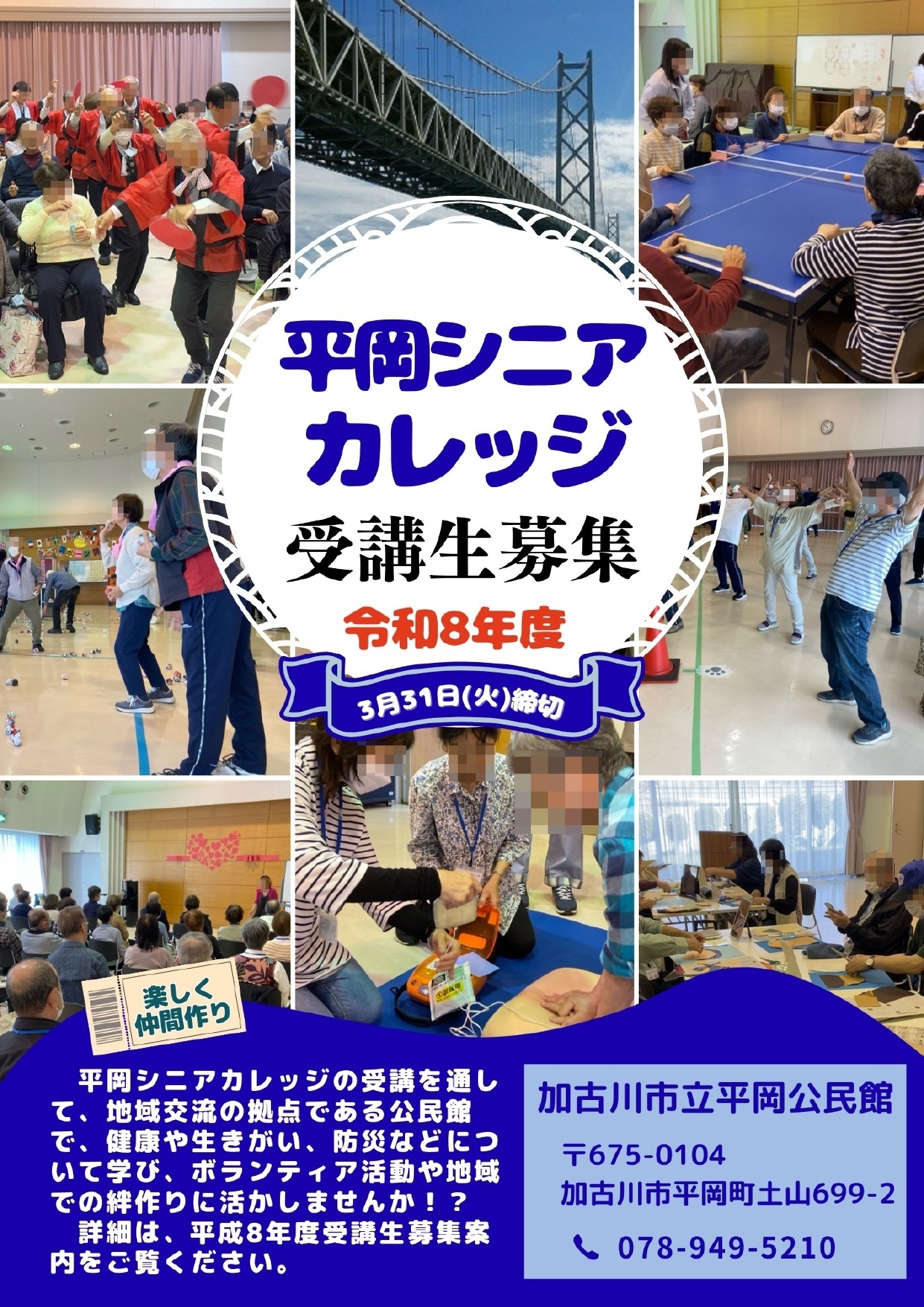 加古川市在住のシニアの皆さん、平岡シニアカレッジ(高齢者大学)で多くの仲間と充実したシニアライフを楽しみませんか。