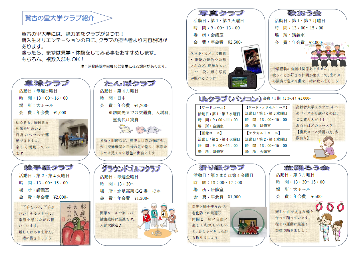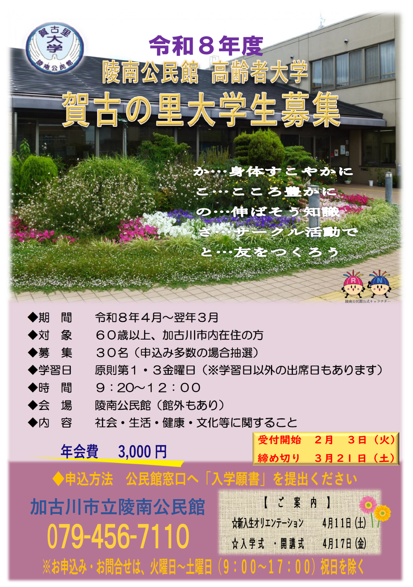 賀古の里大学新入生募集!(陵南公民館 高齢者大学) 更新日:2026年01月29日 ただいま、新入生募集中! 下のチラシや活動内容などご覧いただき、ご応募ください。 申し込みは、陵南公民館ロビーにもご用意しています♪ 令和8年度賀古の里大学入学願書 (PDFファイル: 300.7KB) 令和8年度賀古の里大学入学願書 (Wordファイル: 29.4KB) この記事に関するお問い合わせ先 担当課:陵南公民館郵便番号:675-0019住所:加古川市野口町水足333-333電話番号:079-456-7110ファックス番号:079-427-6755問合せメールはこちら みなさまのご意見をお聞かせください このページの内容は分かりやすかったですか。 分かりやすかったふつう分かりにくかった このページは見つけやすかったですか。 見つけやすかったふつう見つけにくかった