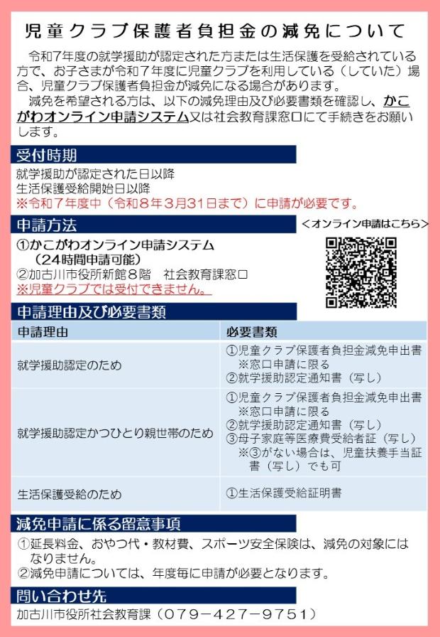 就学援助が認定された方または生活保護を受給されている方で、お子さまが児童クラブを利用している(していた)場合、児童クラブ保護者負担金が減免になる場合があります。