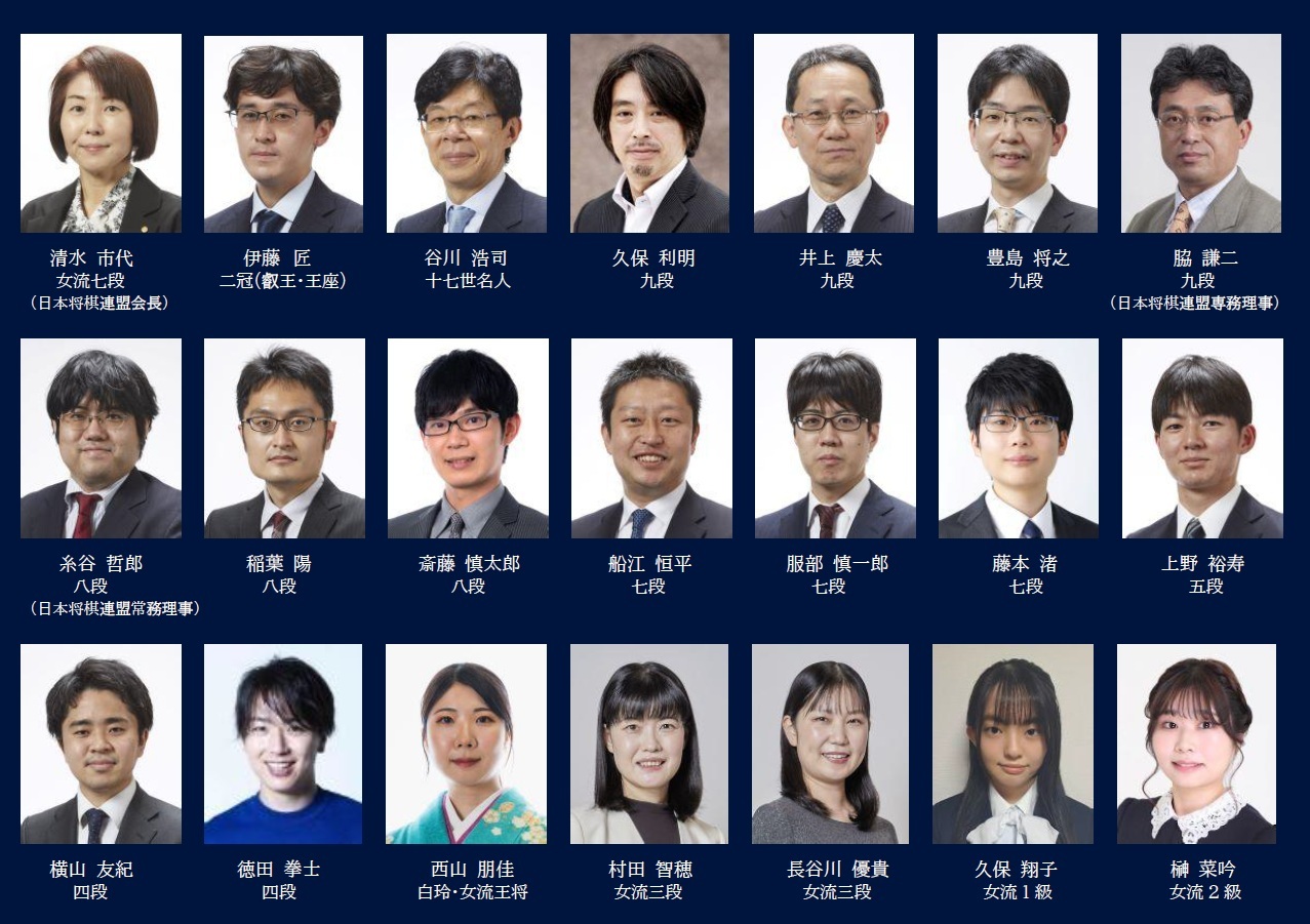 清水 市代女流七段(日本将棋連盟会長)、伊藤 匠二冠(叡王・王座)、谷川 浩司十七世名人、久保 利明九段、井上 慶太九段、豊島 将之九段、脇 謙二九段(日本将棋連盟専務理事)、糸谷 哲郎八段(日本将棋連盟常務理事)、稲葉 陽八段、斎藤 慎太郎八段、船江 恒平七段、服部 慎一郎七段、藤本 渚七段、上野 裕寿五段、横山 友紀四段、徳田 拳士四段、西山 朋佳白玲・女流王将、村田 智穂女流三段、長谷川 優貴女流三段、久保 翔子女流1級、榊 菜吟女流2級