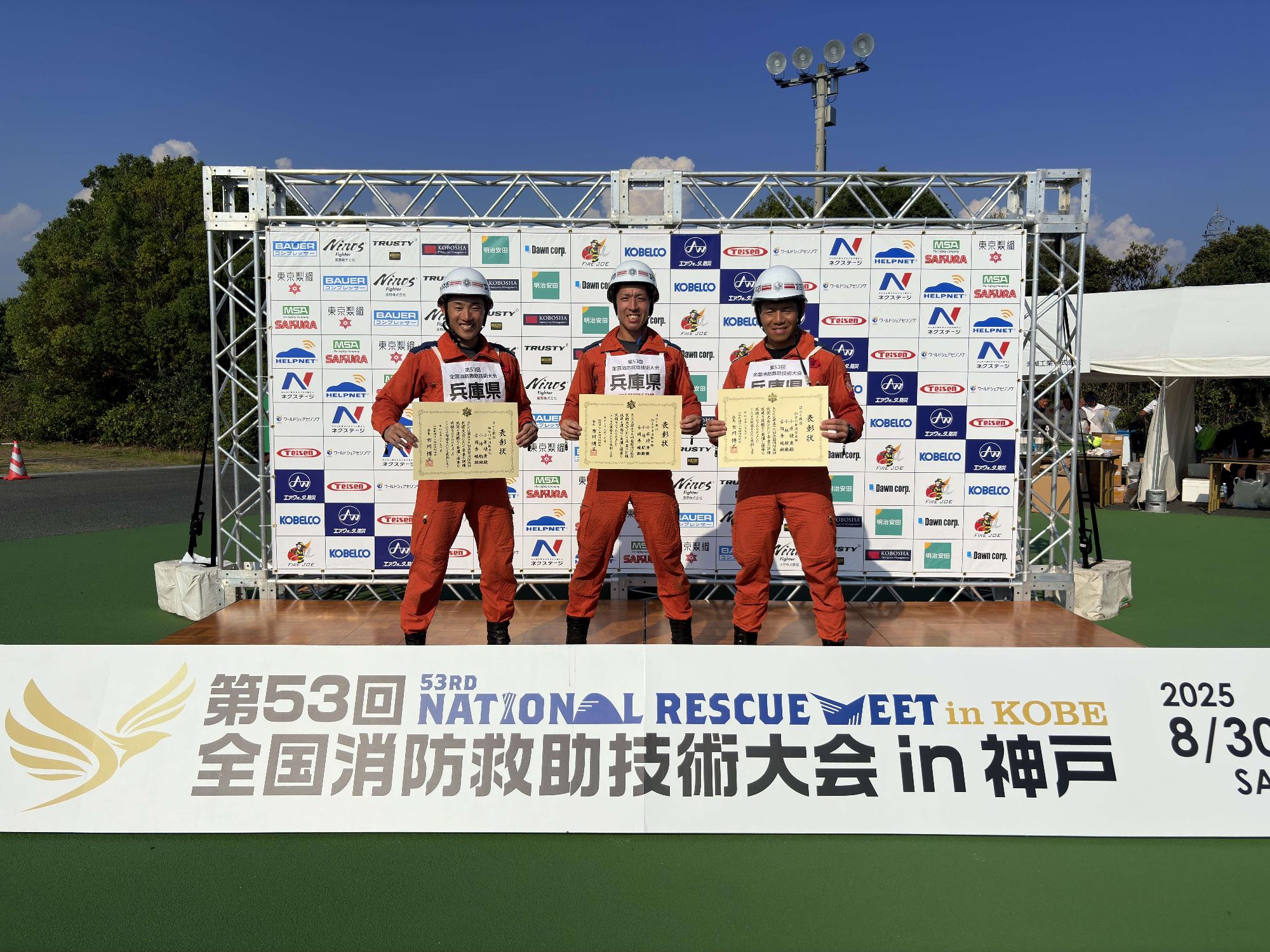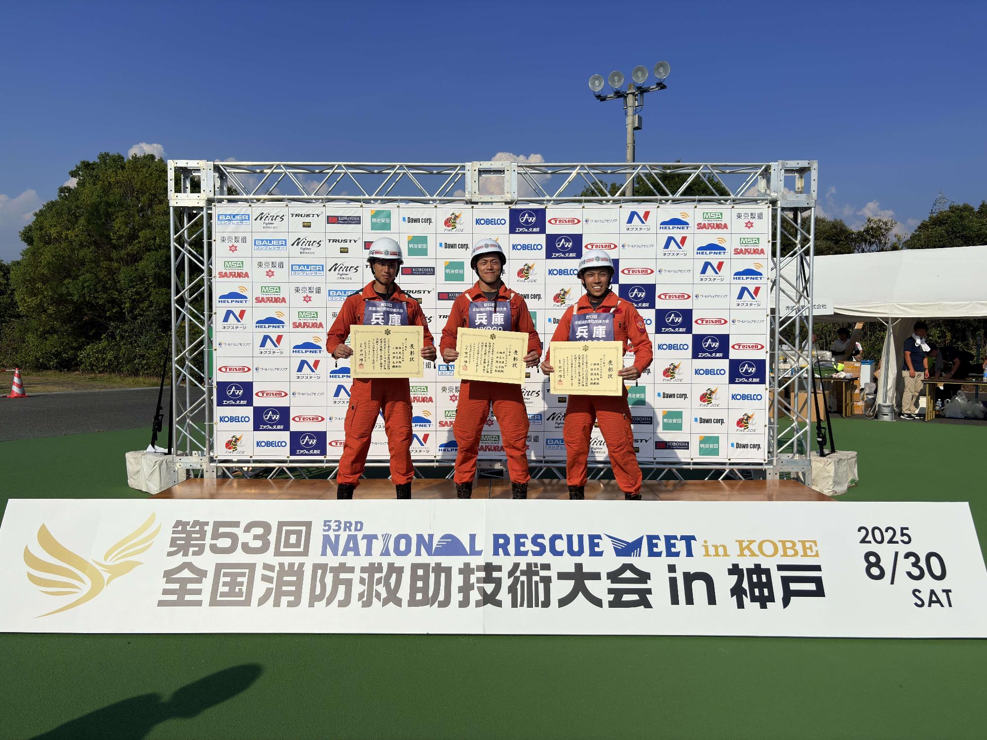 令和7年8月30日(土曜日)兵庫県立広域防災センター(三木市志染町御坂1-19)で開催された「第53回全国消防救助技術大会」において、近畿地区代表として加古川市消防本部から「ほふく救出訓練」に2組6名が出場しました。